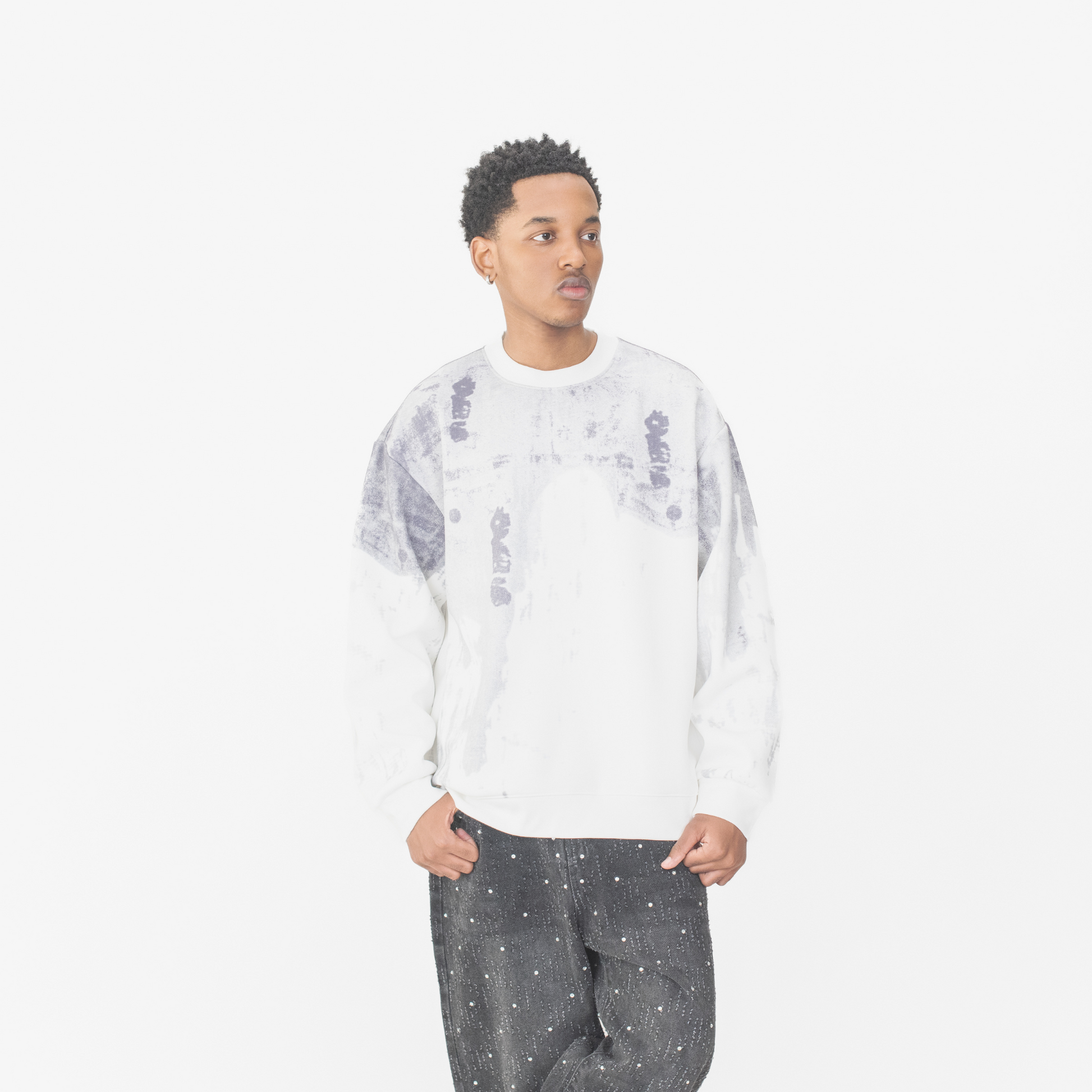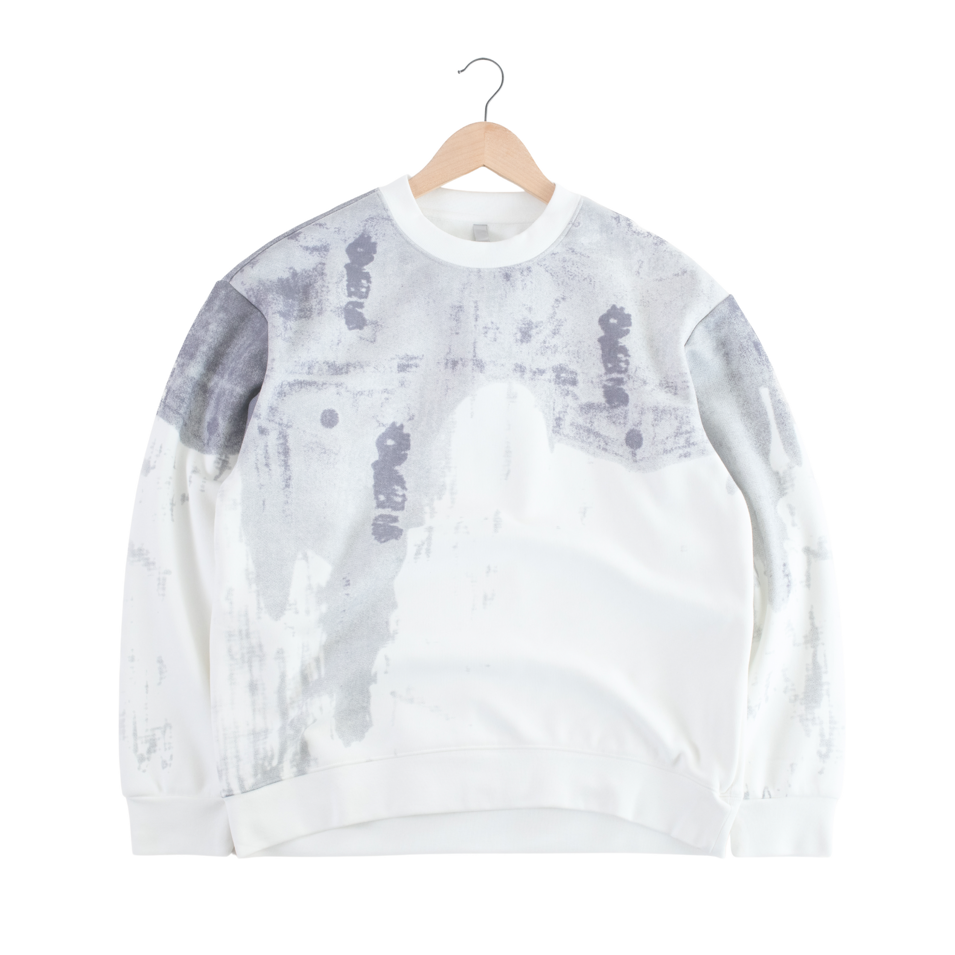 Step into elevated minimalism with the Concrete Fade Sweatshirt. This piece showcases a washed grey and white abstract print reminiscent of worn concrete walls, giving off a raw, urban aesthetic. The soft fleece-lined fabric ensures comfort without sacrificing streetwear edge. Perfect for monochrome layering or standing out with understated boldness.