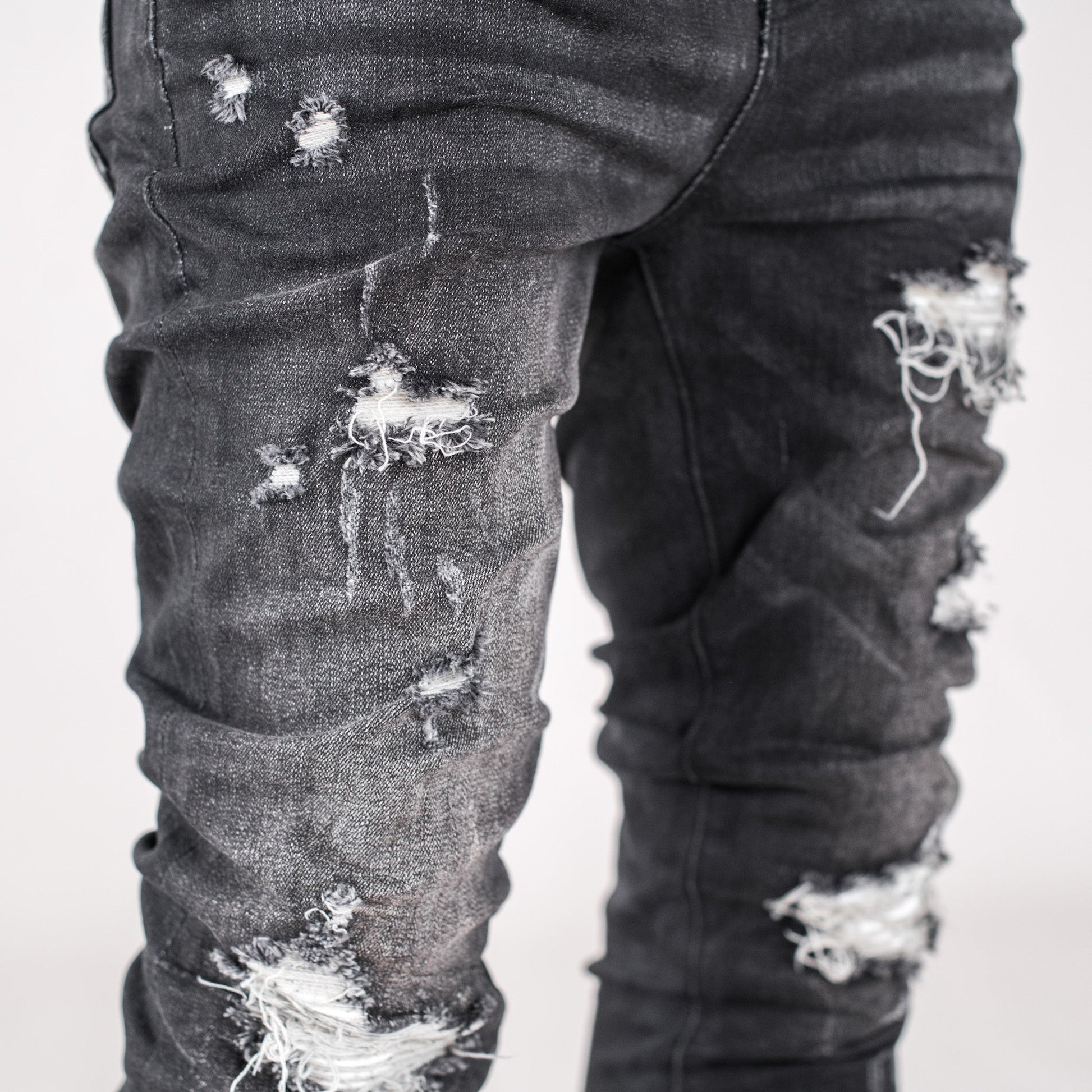 Level up your streetwear game with the Gee2 Asphalt Edge Distressed Skinny Jeans. Crafted from premium stretch denim, these jeans come in a washed charcoal black finish that gives off a rugged yet refined vibe. Designed with heavy distressing across the front thighs and knees, featuring shredded patchwork and raw fray details for a bold, rebellious edge. The slim-tapered silhouette offers a modern skinny fit that hugs in all the right places, while maintaining comfort and flexibility for daily wear.