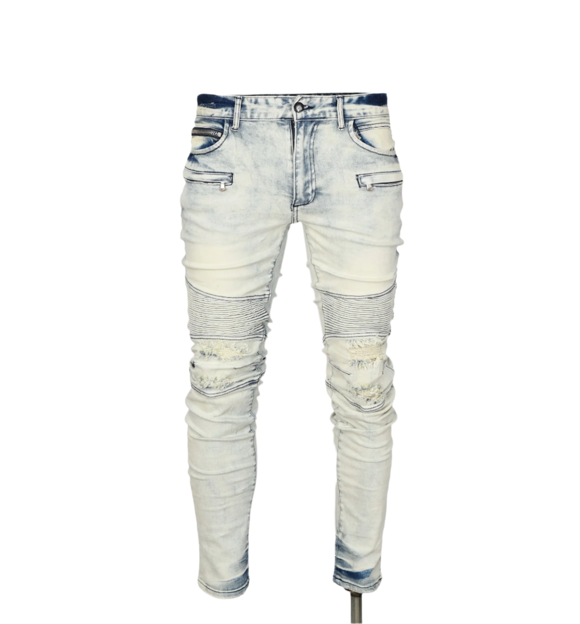 Men Biker dirty wash skinny ripped knee design fashion denim…dirty blue super stretch skinny full length denim…