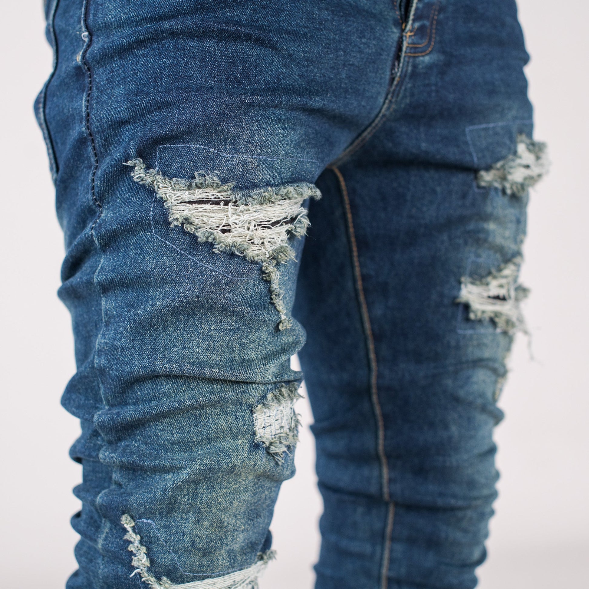 The mid-wash blue tone gives it a vintage worn-in vibe, enhanced with fade effects and rugged stitch finishes. Designed to sit snug on the body, the skinny cut ensures a clean silhouette without sacrificing flexibility. Whether you are hitting the streets or pairing with a jacket for a night out, these jeans are made to stand out.