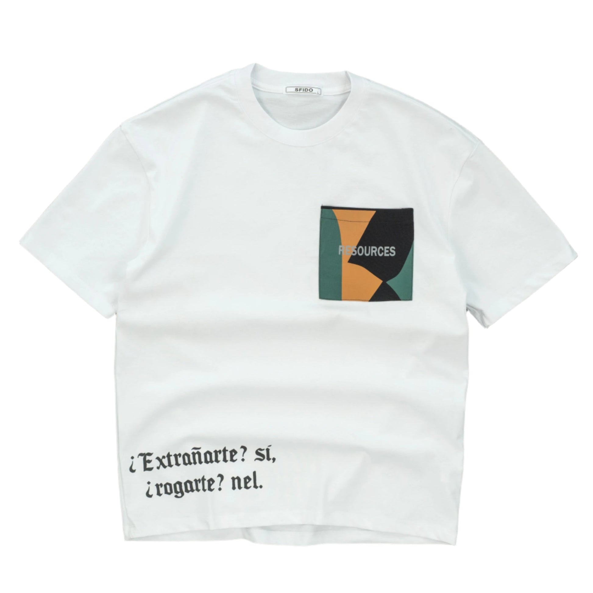 This stylish and contemporary T-shirt features a bold, colorful geometric design on the chest pocket with the word “RESOURCES” printed. Available in various colors including green, brown, black, and white, it adds a pop of creativity to your everyday look. The shirt also has an intriguing Spanish phrase printed near the bottom: “¿Extrañarte? Sí, ¿rogarte? Nel,” which translates to “Miss you? Yes, beg you? No.” Made from comfortable, high-quality fabric, it’s perfect for casual wear with a modern twist.