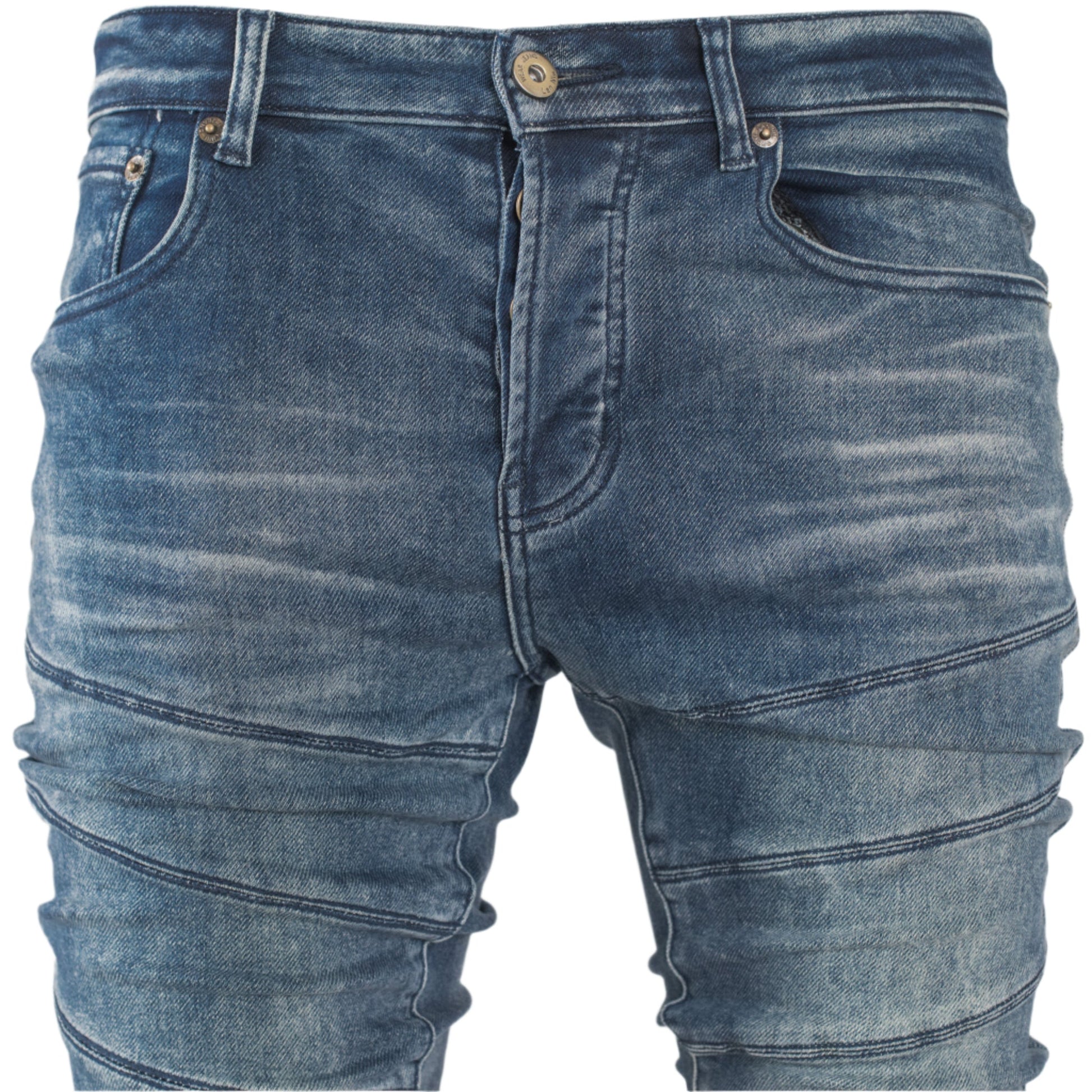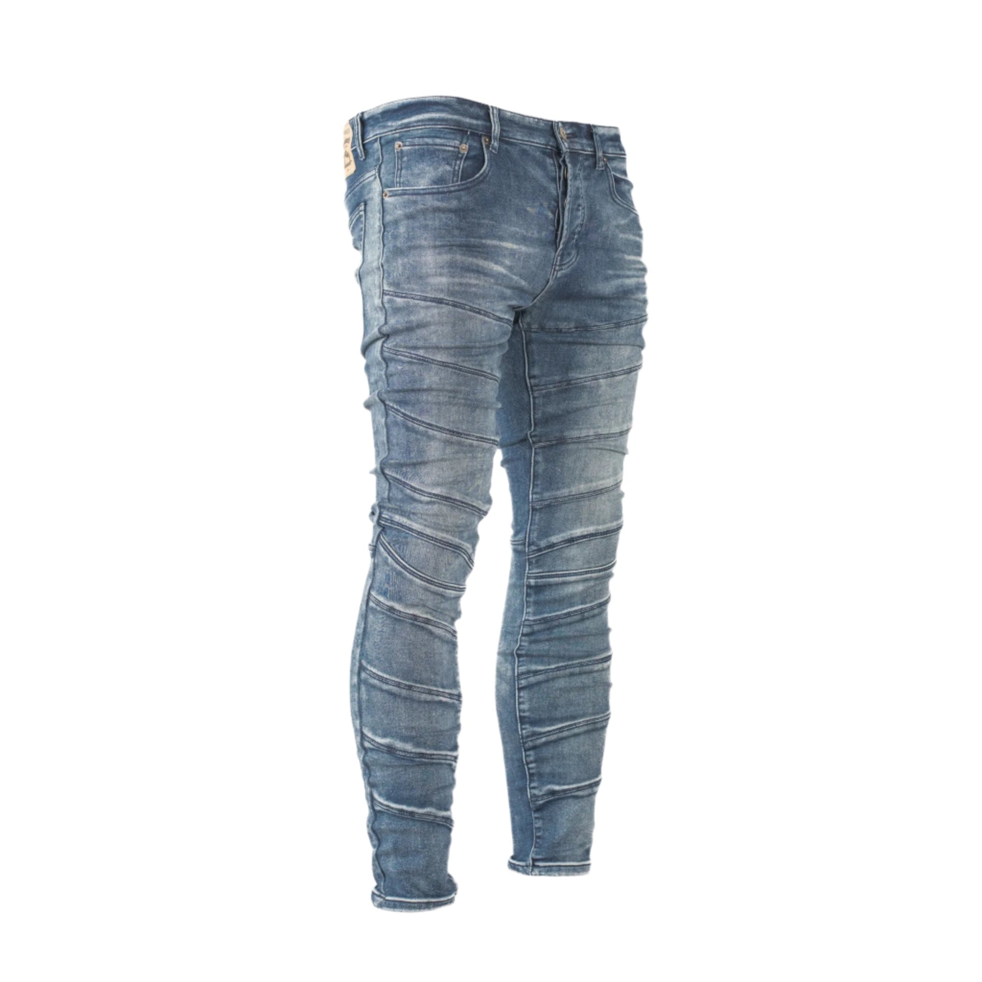 Step up your streetwear game with the Twisted Torque Skinny Denim — engineered for the bold, crafted for the streets. These standout jeans feature a mid-wash blue tone with expertly placed 3D wrinkle effects and diagonal seam detailing that wraps around the leg, creating a twisted, torque-like visual effect. The stacked fit enhances the tapered leg design, hugging tightly through the thighs and calves for a true skinny silhouette.