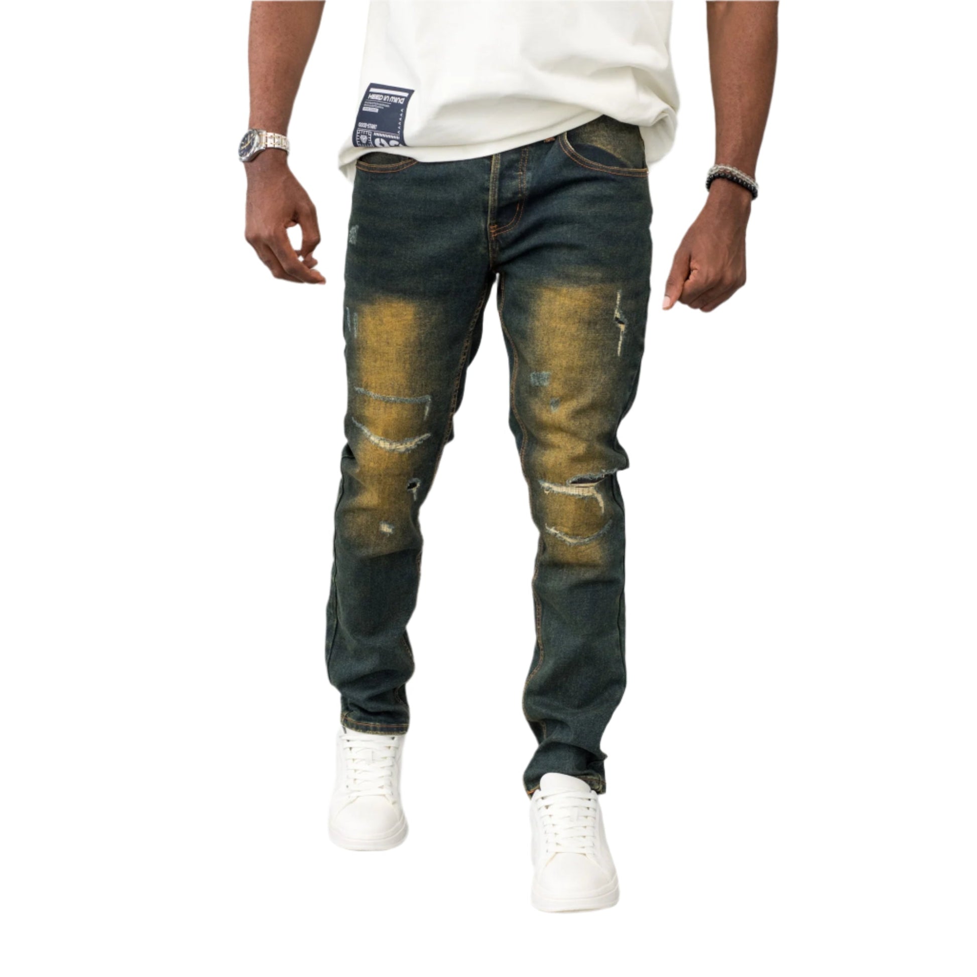 Upgrade your denim game with these uniquely crafted distressed jeans. Featuring a bold gradient fade design and subtle distressing details, this piece combines casual edge with stylish flair. Perfect for pairing with sneakers and a basic tee.
